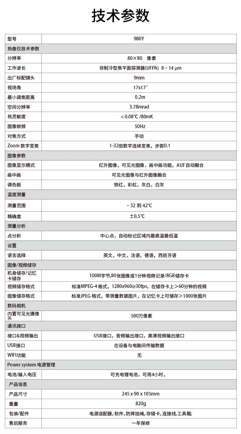 分辨率:80*80、圖像幀頻:50HZ、篩查測(cè)溫范圍:32-42℃、可外接HDMI大屏顯示