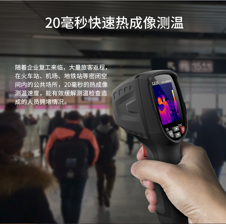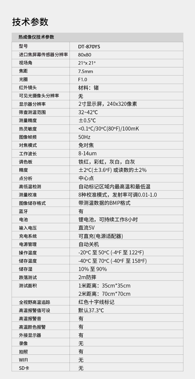分辨率:80*80、圖像幀頻:50HZ、篩查測溫范圍:32-42℃、DT-8780YS外接10.1英寸PAD大屏,可實(shí)現(xiàn)多人同時測溫,AI人臉識別