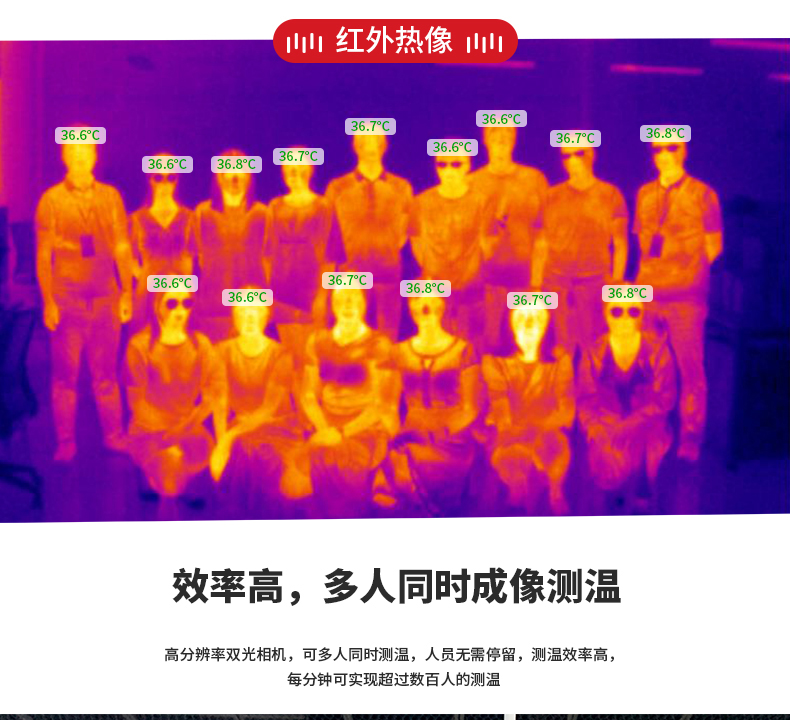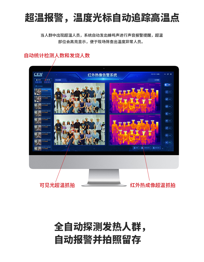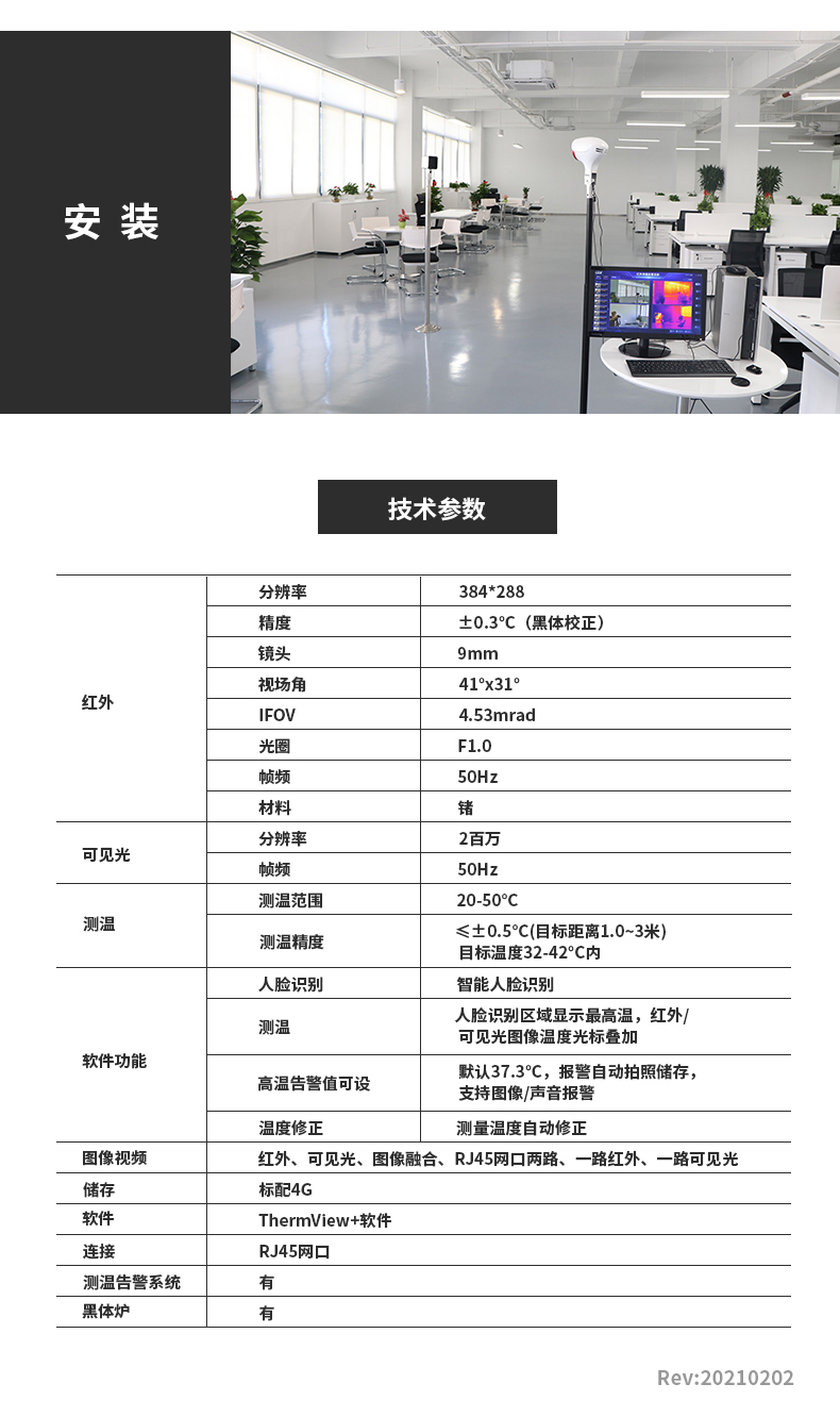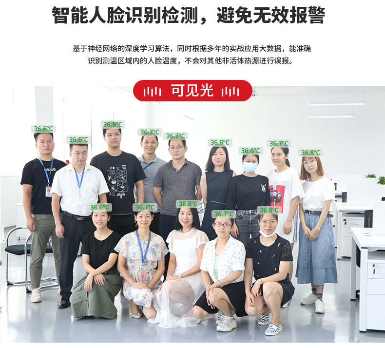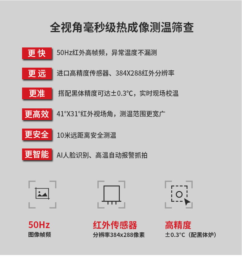 ·標配黑體,實時溫度校正,測溫精度士0.3°℃·智能快速識別測溫,效率可達900人/分鐘·AI人臉識別,排除異常熱源干擾,誤報率更低20年非接觸紅外測溫研發(fā)經驗,測溫更優(yōu)更準確