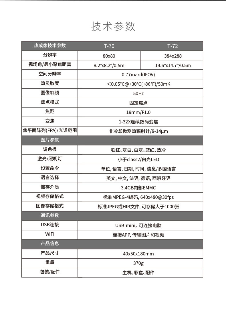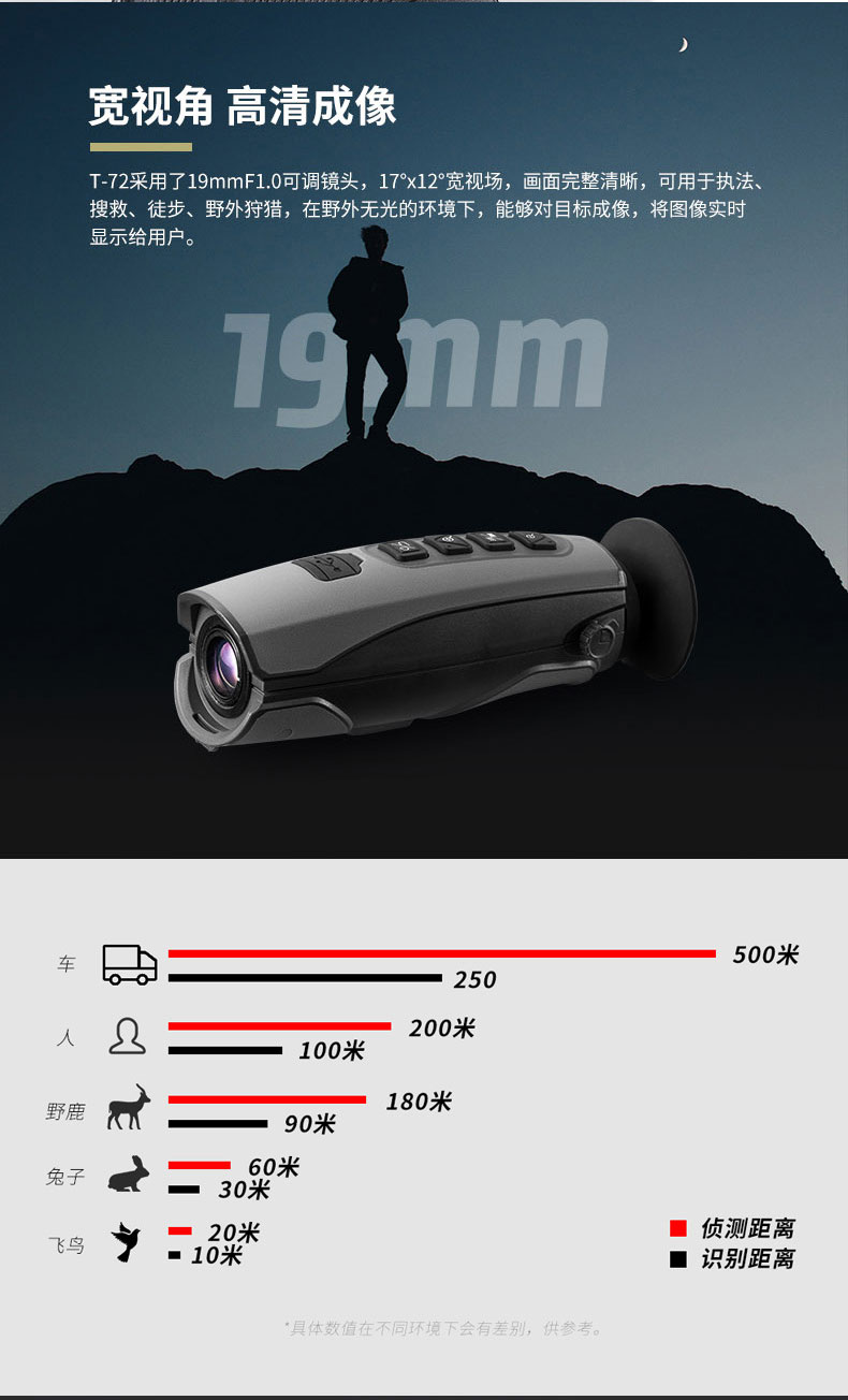 T-72系列熱成像儀望遠鏡 ●384*288進口傳感器 ●32倍連續(xù)放大靈活觀看 ●50Hz高圖像幀頻 ●WIFI連接實時圖像傳輸 ●可選外接大屏
