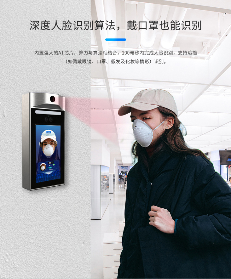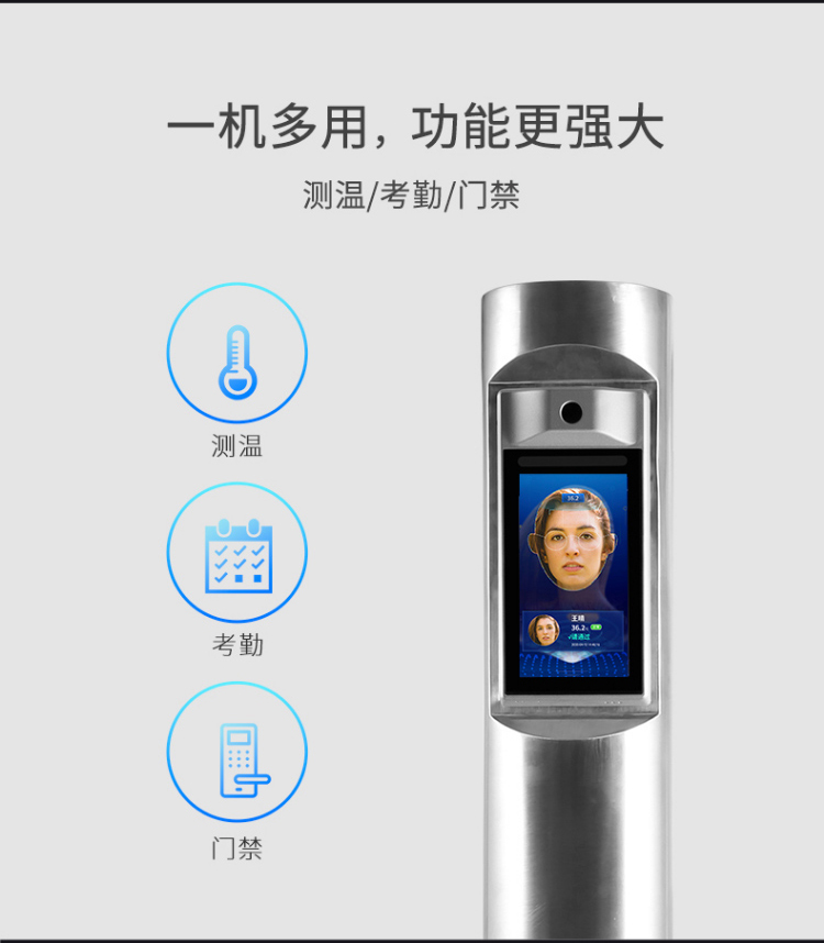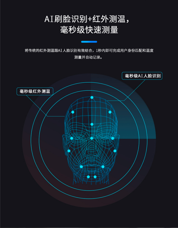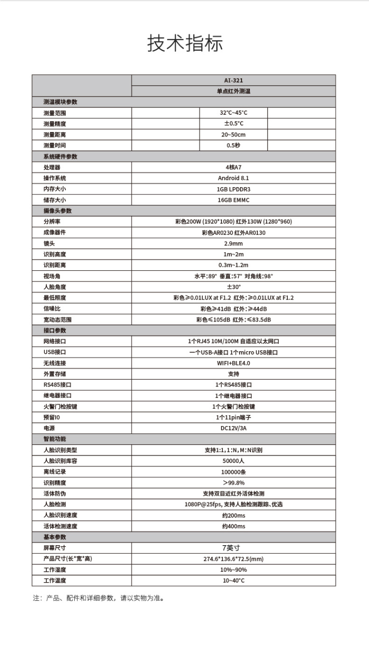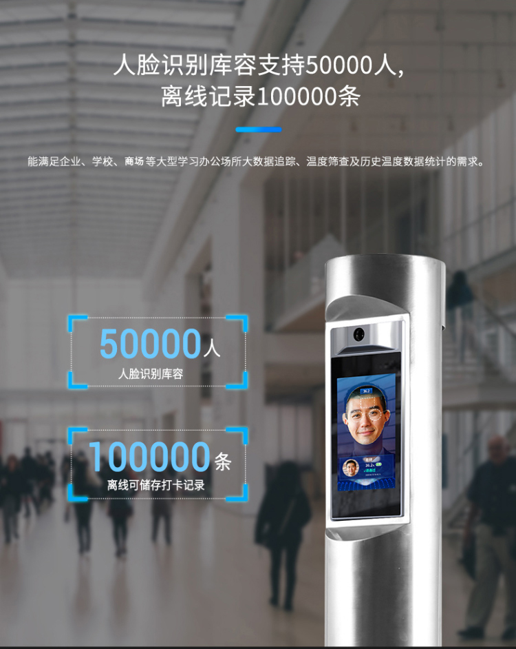 單點紅外測溫、測溫范圍:16-45℃、50000大容量存儲、只能AI人臉識別、一機多用