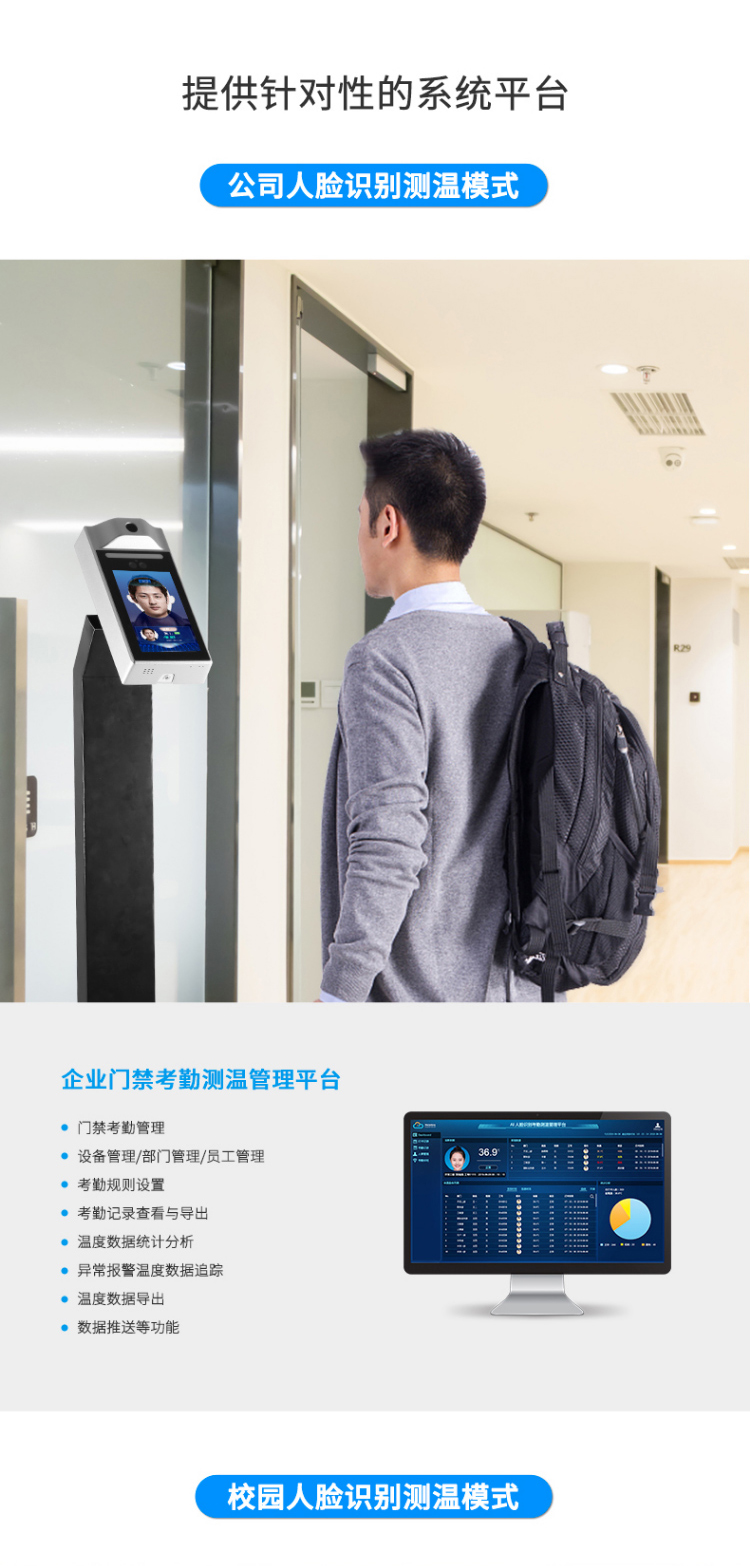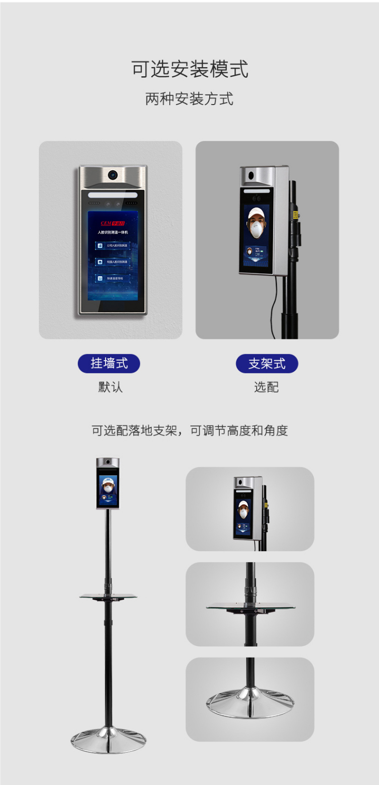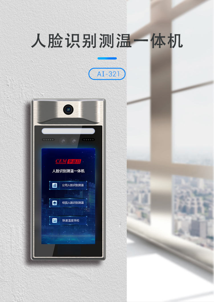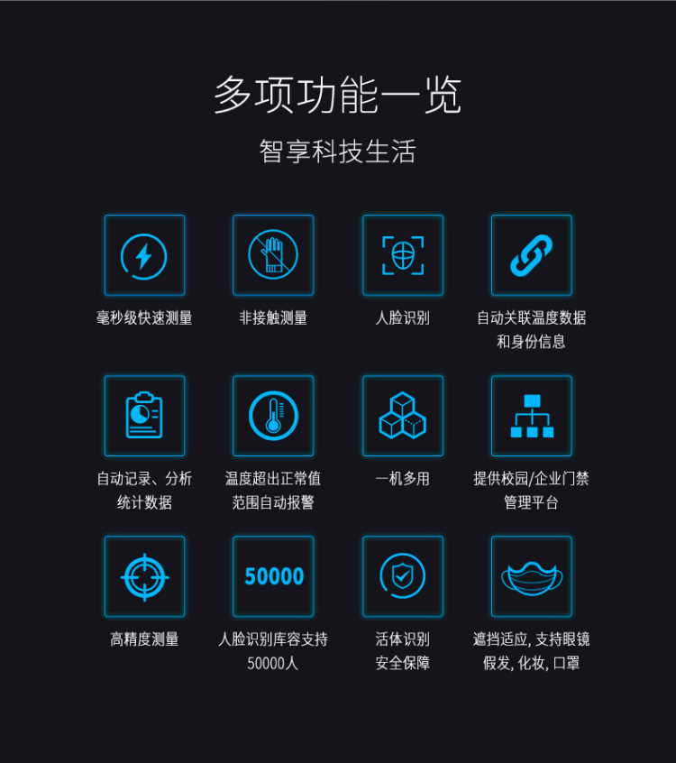 單點紅外測溫、測溫范圍:16-45℃、50000大容量存儲、只能AI人臉識別、一機多用