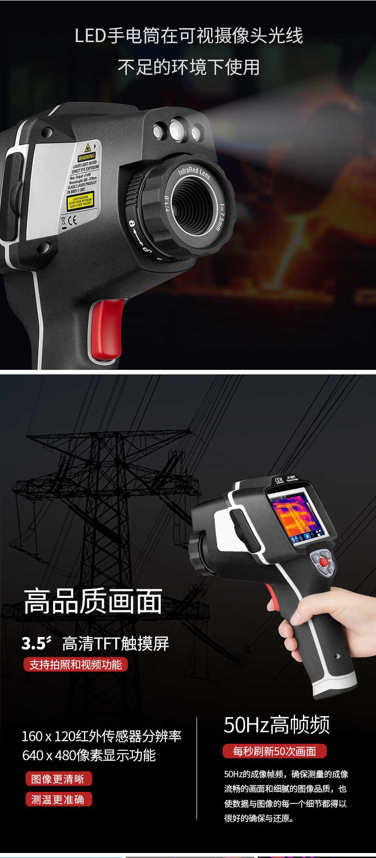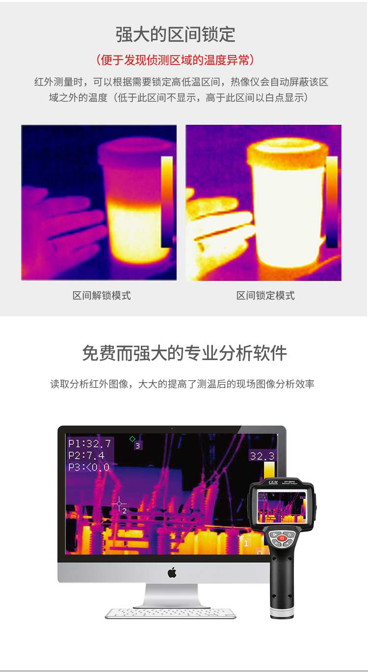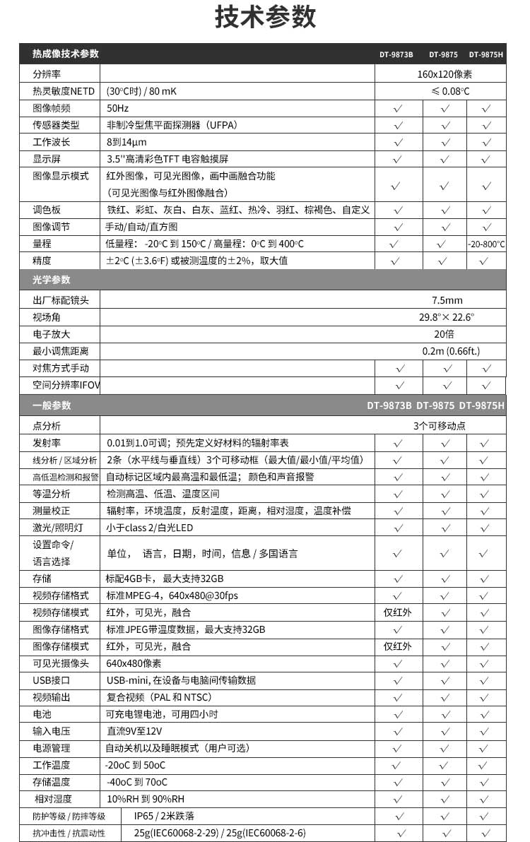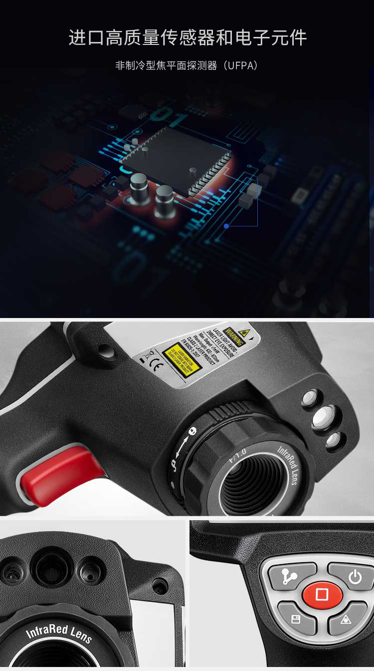 標(biāo)配鏡頭7.5mm,分辨率160×120,IFOV:3.33mard,視場角29.8×22.6°,熱靈敏度NETD<0.08℃,圖像幀頻50Hz,溫度范圍(-20-800),可見光分辨率640×480像素