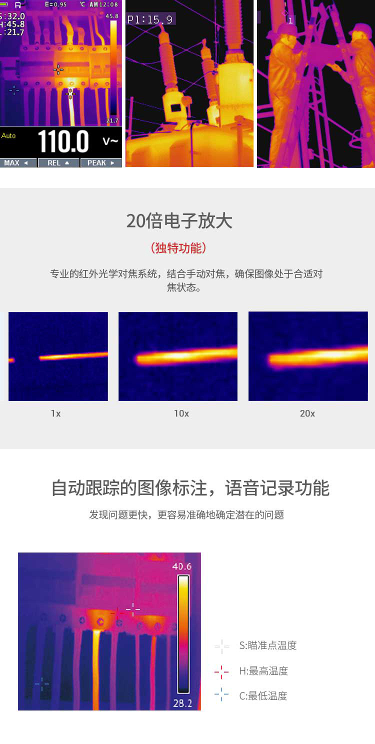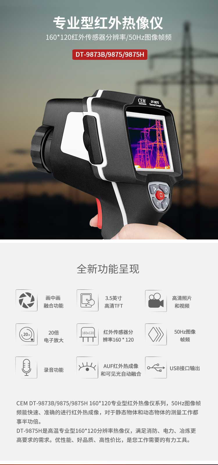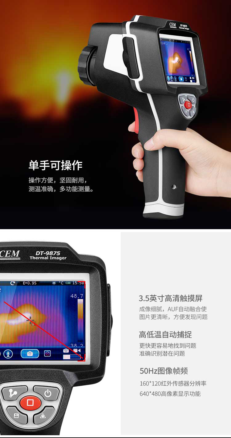 標(biāo)配鏡頭7.5mm,分辨率160×120,IFOV:3.33mard,視場角29.8×22.6°,熱靈敏度NETD<0.08℃,圖像幀頻50Hz,溫度范圍(-20-800),可見光分辨率640×480像素