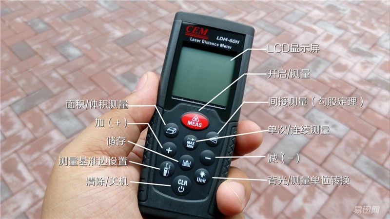 LDM-60H激光測(cè)距儀的功能按鍵為10鍵分布,紅色按鍵為開關(guān)鍵和測(cè)量按鍵。其他9鍵分別對(duì)應(yīng)日常測(cè)量工作所需的各種功能。激光測(cè)距儀可使用的范圍還是比較廣的,比如距離測(cè)量、房屋驗(yàn)收、室內(nèi)裝修、家具安裝、工程測(cè)量、機(jī)械工程、交通消防、規(guī)劃行業(yè)、裝潢行業(yè)、倉庫物流、建筑施工等,所以,這9鍵對(duì)應(yīng)的功能還是很實(shí)用的。后邊,筆者將就自己用到的一些功能分享出來。