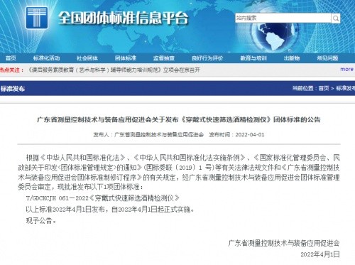 近日,由我們總公司深圳市華盛昌科技實(shí)業(yè)股份有限公司牽頭起草的《穿戴式快速篩選酒精檢測儀》團(tuán)體標(biāo)準(zhǔn)審定會(huì)已經(jīng)過廣東省測量控制技術(shù)與裝備應(yīng)用促進(jìn)會(huì)的審查,《穿戴式快速篩選酒精檢測儀》團(tuán)體標(biāo)準(zhǔn)于2022年4月1日在全國團(tuán)體標(biāo)準(zhǔn)信息平臺正式發(fā)布并實(shí)施。