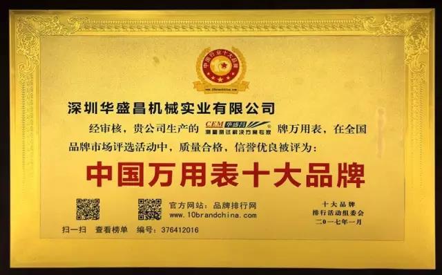 厲害了!華盛昌榮獲“2016年度中國萬用表十大品牌”