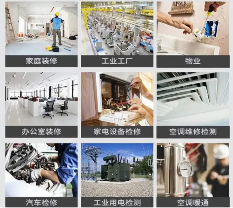 用于家庭或辦公室裝修、物業(yè)維修、家電設(shè)備檢修、汽車(chē)檢修、工業(yè)用電檢測(cè)等場(chǎng)景。